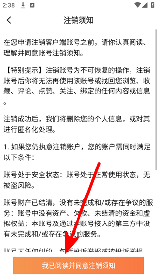 3、在注銷須知頁面,點擊我已閱讀并同意注銷須知按鈕,進入賬號驗證頁面。