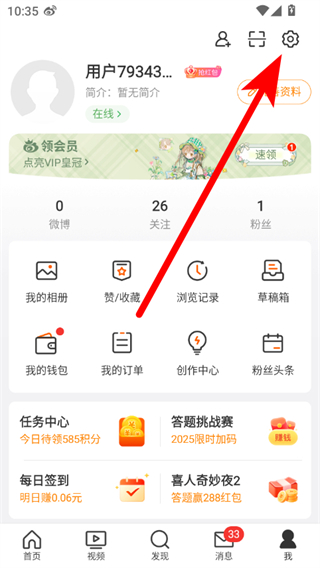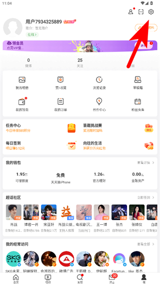 2、在個人界面中,點(diǎn)擊右上角的設(shè)置圖標(biāo),進(jìn)入設(shè)置頁面。