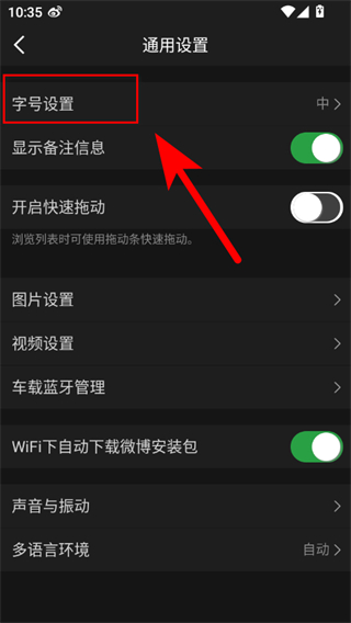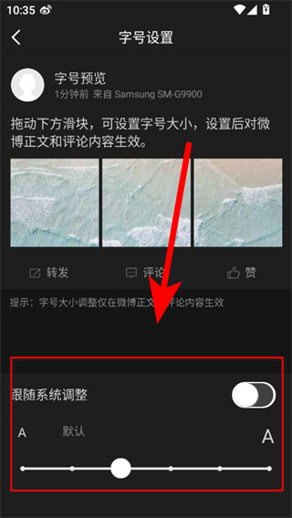 4、在字號設(shè)置頁面可通過滑動滑塊或開啟跟隨系統(tǒng)調(diào)整,完成微博字體大小的設(shè)置操作。