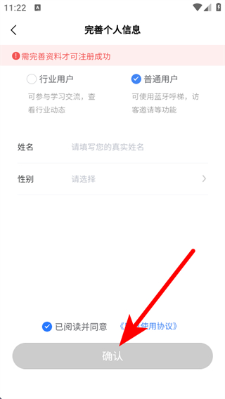 4、進(jìn)入完善頁(yè)面,選擇用戶類型,填寫信息后,點(diǎn)擊確認(rèn),完成注冊(cè)。