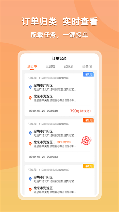 可顯示通話記錄,訂單中出現(xiàn)的任何狀況,可以通過界面上的電話進行及時溝通,方便第一時間處理問題