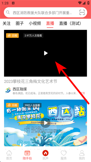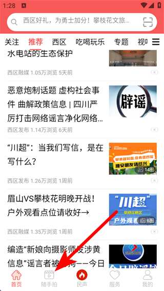 1、打開看西區(qū)APP首頁,點擊底部隨手拍,進入相關(guān)板塊頁面。