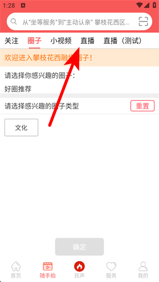 2、在該板塊頁面,點擊直播的選項,進入直播板塊的界面。