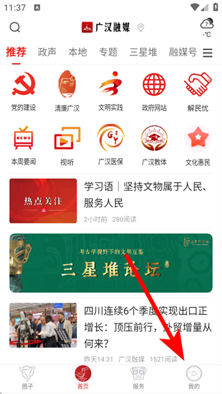 1、打開(kāi)廣漢融媒APP,點(diǎn)擊底部導(dǎo)航欄的我的,進(jìn)入個(gè)人頁(yè)面。