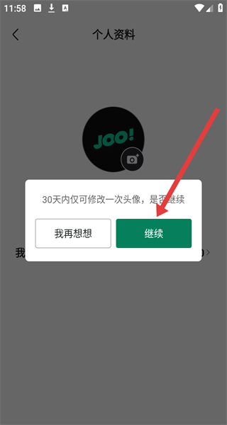 3、點(diǎn)擊頭像修改按鈕,彈出“30天內(nèi)僅可修改一次頭像,是否繼續(xù)”的確認(rèn)彈窗,點(diǎn)擊“繼續(xù)”。