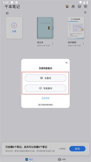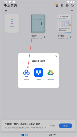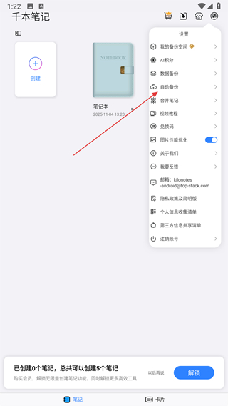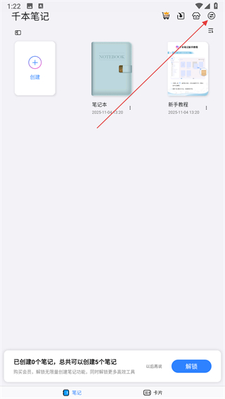 1、打開(kāi)千本筆記應(yīng)用進(jìn)入主界面,點(diǎn)擊創(chuàng)建按鈕,在彈出的選項(xiàng)中選擇筆記本,進(jìn)入創(chuàng)建筆記本流程。