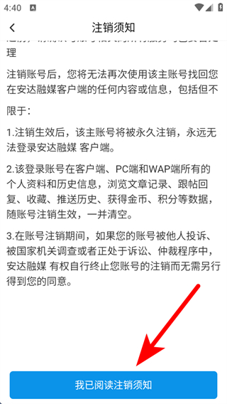 4、在注銷須知操作頁面,點擊我已閱讀注銷須知,依照提示完成注銷。