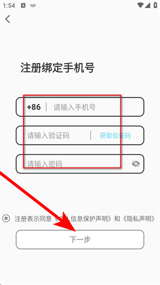 4、進(jìn)入注冊綁定手機號頁面,依次輸入手機號、驗證碼以及密碼,最后點擊下一步按鈕。