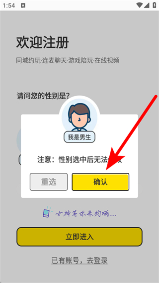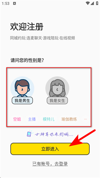 2、在歡迎注冊頁面,選擇自己的性別,然后點擊立即進(jìn)入按鈕。