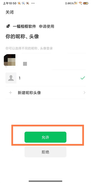 3、在登錄方式選擇界面,選擇微信登錄方式,點(diǎn)擊允許按鈕,授權(quán)一幅相框使用微信的昵稱、頭像。
