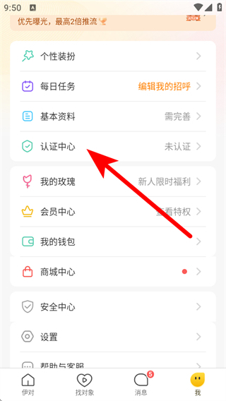 1、打開伊對(duì)APP,點(diǎn)擊右下角我,進(jìn)入個(gè)人頁面后點(diǎn)擊認(rèn)證中心選項(xiàng)。