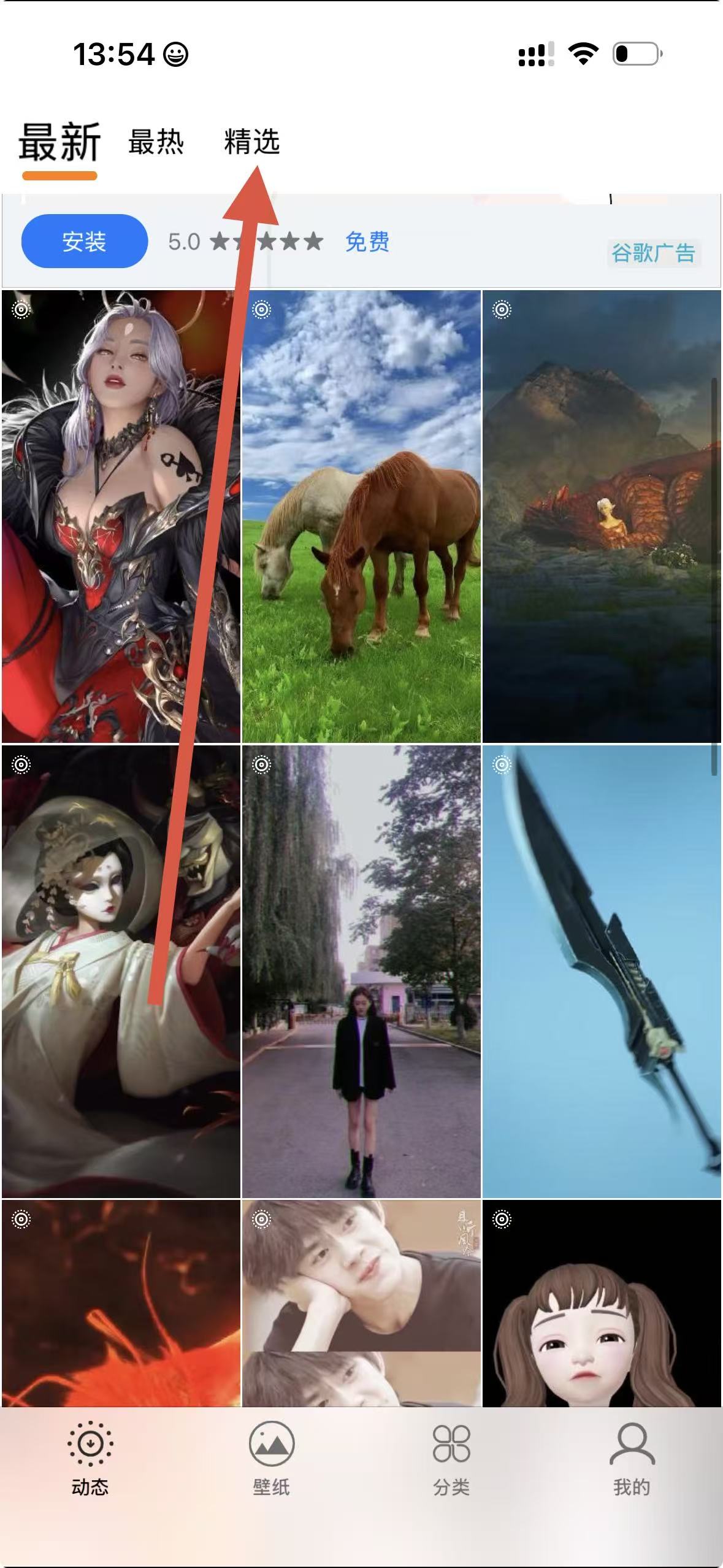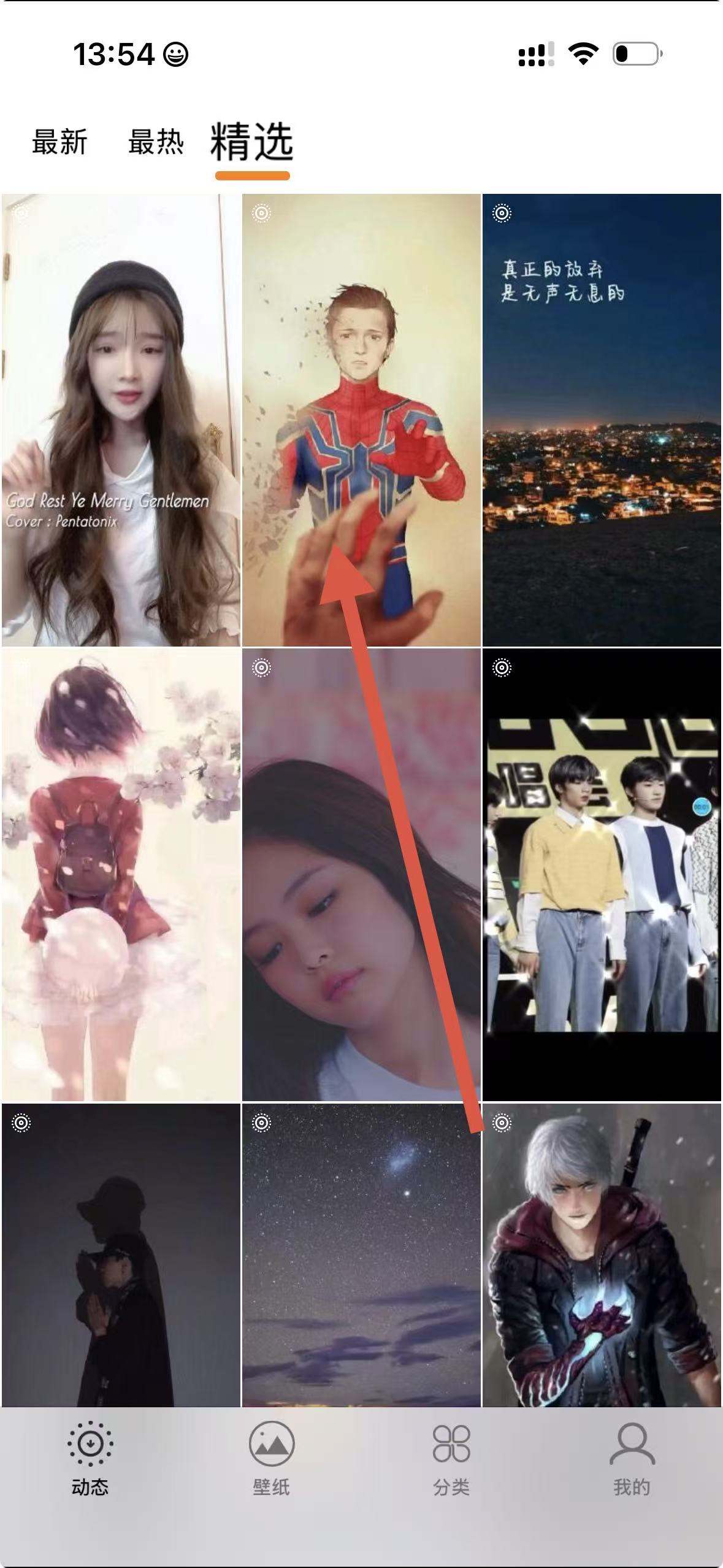 1、打開(kāi)壁紙應(yīng)用,點(diǎn)擊上方精選選項(xiàng)。