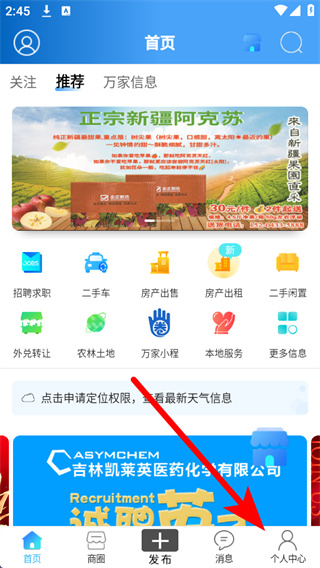 1、打開敦化萬家APP,點(diǎn)擊個(gè)人中心,進(jìn)入個(gè)人功能頁面。