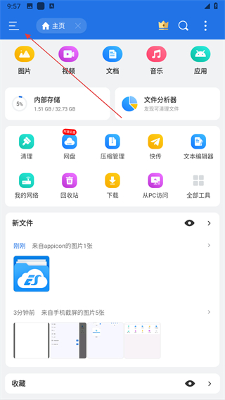 1、打開(kāi)ES文件瀏覽器,點(diǎn)擊左上角三條橫線圖標(biāo)。