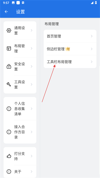 3、在設(shè)置頁(yè)面,點(diǎn)擊工具欄布局管理選項(xiàng)。