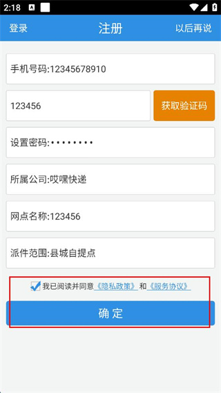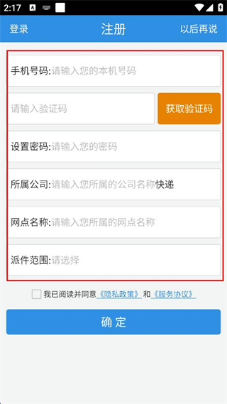 3、設(shè)置密碼,輸入所屬公司、網(wǎng)點(diǎn)名稱,選擇派件范圍。