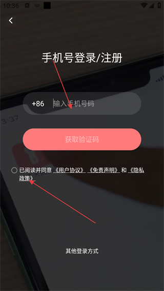 3、輸入手機號碼,點擊獲取驗證碼,勾選同意用戶協(xié)議。