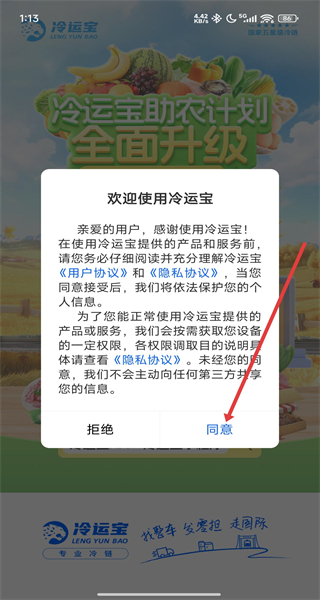 1、打開冷運(yùn)寶APP,點(diǎn)擊同意按鈕,確認(rèn)《用戶協(xié)議》和《隱私協(xié)議》,進(jìn)入登錄界面。