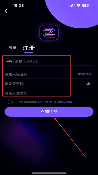 4、輸入手機(jī)號、驗證碼、密碼以及邀請碼,再點(diǎn)擊立即注冊。