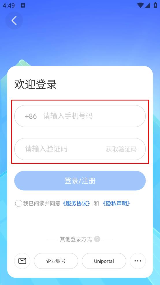3、在歡迎登錄頁面輸入手機號碼,點擊獲取驗證碼,輸入驗證碼,勾選已閱讀并同意相關協(xié)議。