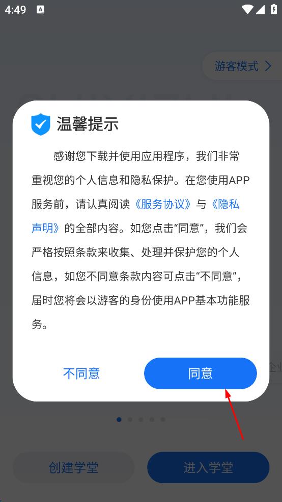1、打開,彈出溫馨提示,點擊同意,進入相關界面。