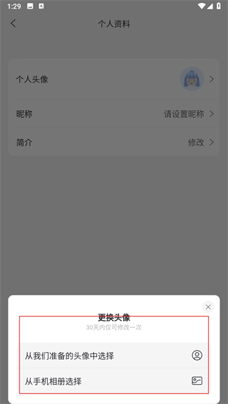 3、在個人資料頁面,點擊個人頭像選項,彈出選項窗口。