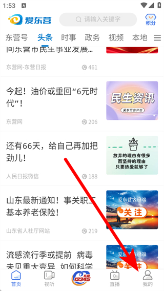 1、打開(kāi)愛(ài)東營(yíng)APP首頁(yè),點(diǎn)擊底部我的按鈕,進(jìn)入個(gè)人的頁(yè)面。