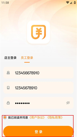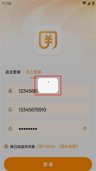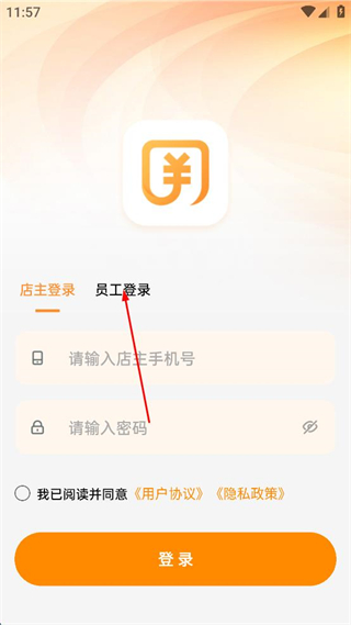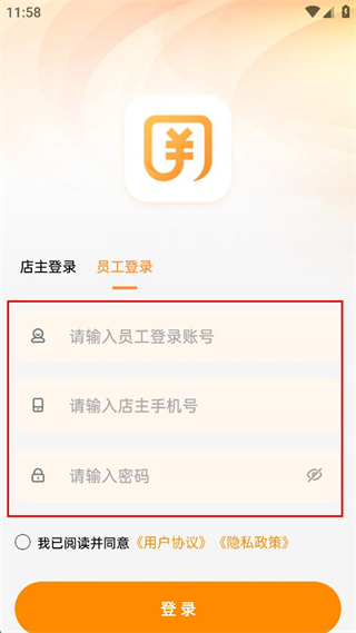 2、在員工登錄界面輸入員工登錄賬號、店主手機(jī)號和密碼。