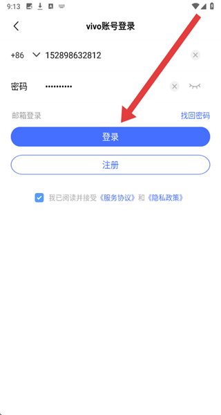 4、輸入手機號碼和密碼,勾選協(xié)議后點擊“登錄”按鈕,完成賬號登錄。