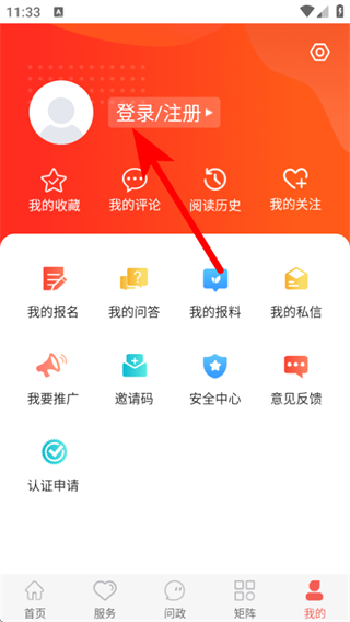 2、在個人頁面中,點(diǎn)擊登錄/注冊的區(qū)域,進(jìn)入賬號密碼登錄界面。