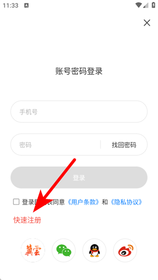 3、進(jìn)入這個界面后,需要點(diǎn)擊快速注冊按鈕,進(jìn)入注冊的頁面。