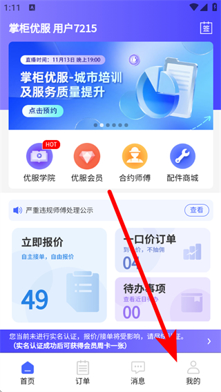 1、打開掌柜優(yōu)服APP,點擊右下角我的,進入個人頁面。
