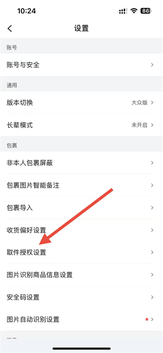 3、在設置界面,點擊取件授權設置選項,進入取件授權頁面。