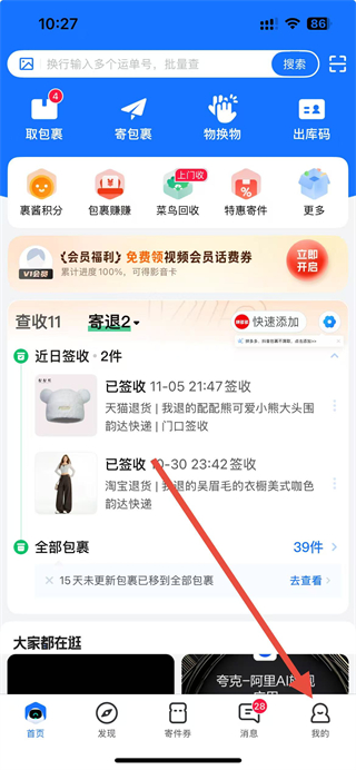 1、打開菜鳥APP,進入首頁后點擊全部包裹,位于查收板塊下方,顯示包裹總數(shù),進入包裹記錄列表頁面。