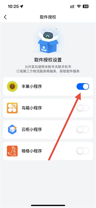 4、在取件授權頁面,點擊開啟豐巢小程序右側開關按鈕,即可完成豐巢柜取件授權。