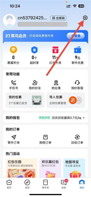 1、打開菜鳥app,進入我的,點擊右上角的設置。