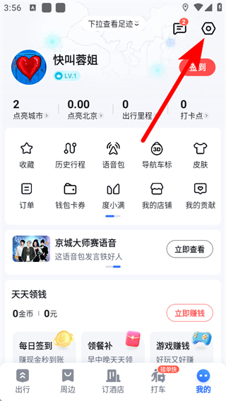 1、打開百度順風(fēng)車APP,點擊右下角我的,進入個人頁面后點擊右上角設(shè)置圖標,進入設(shè)置頁面。