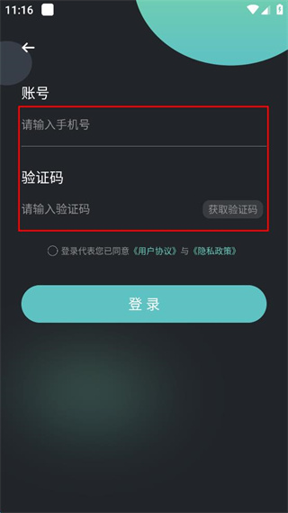 3、在賬號登錄界面,輸入手機(jī)號、驗證碼。