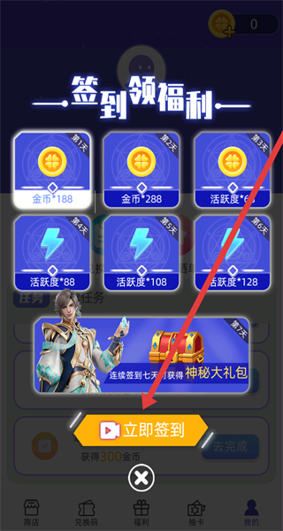 4、在簽到領(lǐng)福利頁(yè)面點(diǎn)擊“立即簽到”,完成簽到操作。
