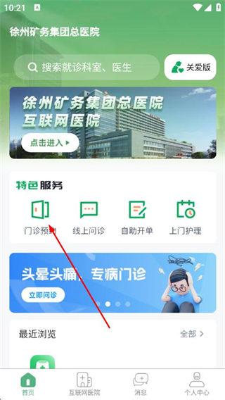 1、打開掌上徐礦總院APP,在首頁點擊門診預(yù)約,進(jìn)入選擇科室頁面。
