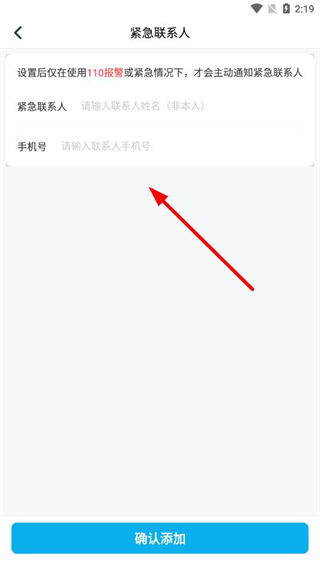 4、在緊急聯(lián)系人頁面,輸入聯(lián)系人信息,點擊確認(rèn)添加即可完成。