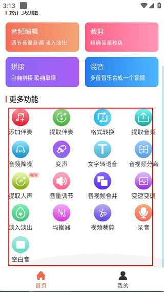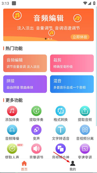 4、登錄后返回首頁(yè),可使用添加伴奏、提取伴奏、格式轉(zhuǎn)換等眾多音頻編輯功能。