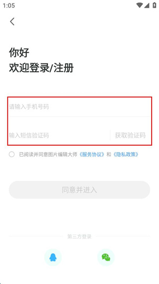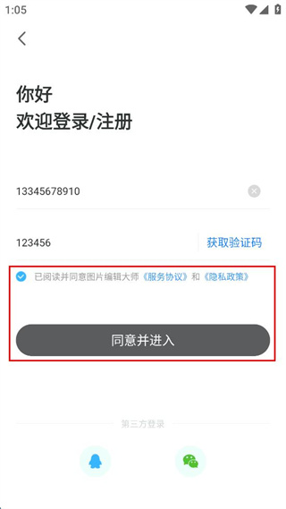 4、勾選已閱讀并同意服務(wù)協(xié)議和隱私政策后點擊“同意并進入”,完成登錄操作。