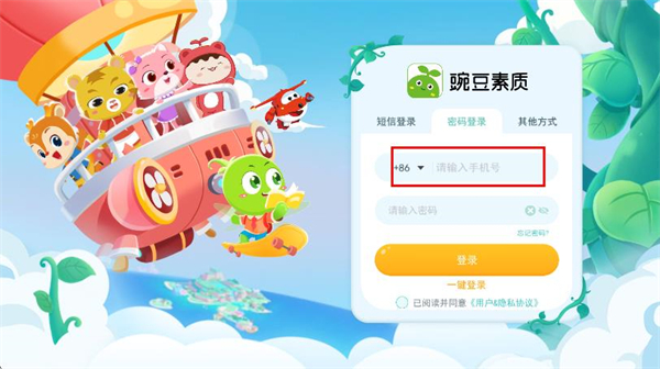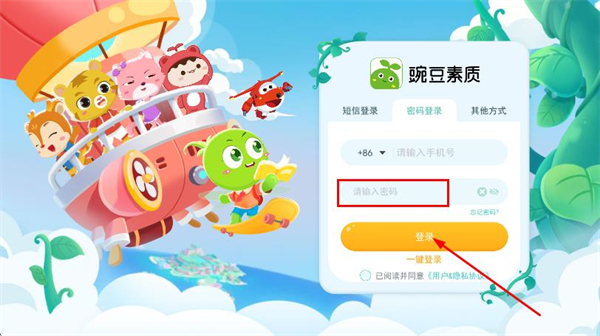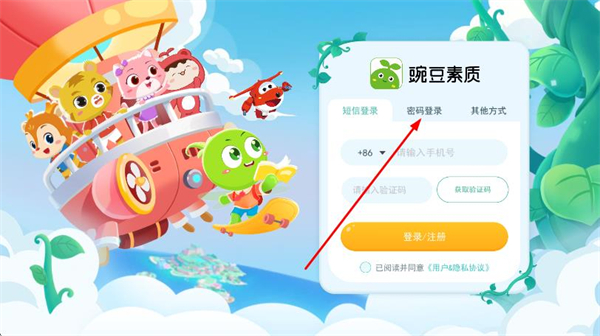 1、打開豌豆素質(zhì)app,點(diǎn)擊密碼登錄選項(xiàng)。