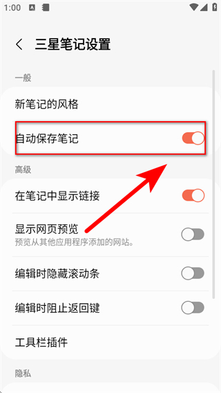 3、在頁面中找到自動保存筆記選項,將其開關(guān)開啟,即可完成設(shè)置。
