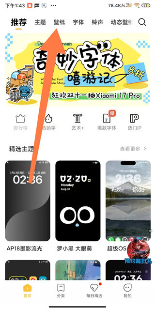 1、在小米桌面APP首頁,點擊上方壁紙選項,進入壁紙頁面。