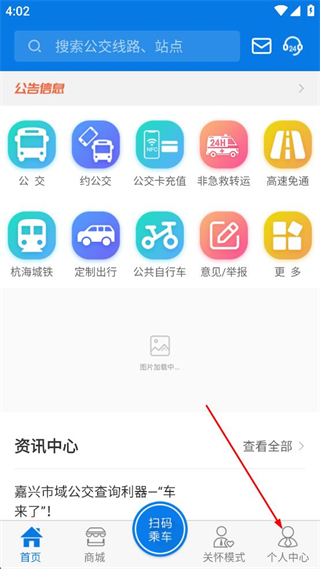1、打開海寧出行類軟件,點(diǎn)擊右下角“個(gè)人中心”按鈕,進(jìn)入個(gè)人界面。