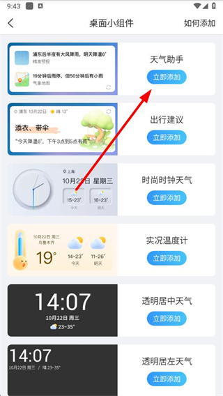 3、進(jìn)入桌面小組件頁面后,選擇想要添加的小組件,點擊立即添加按鈕。