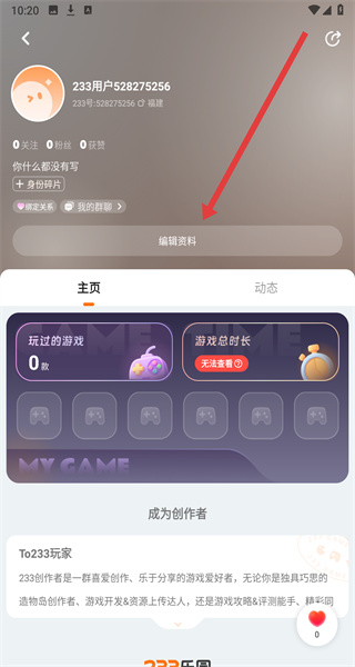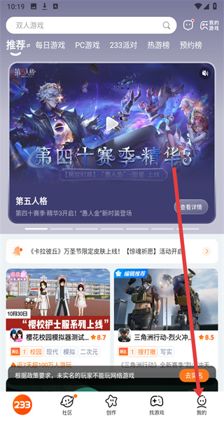 1、在233樂園APP首頁點擊右下角“我的”,進入個人頁面。