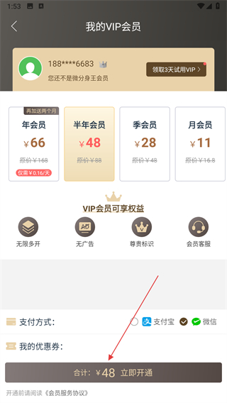 3、選擇會員類型,并選擇支付方式。